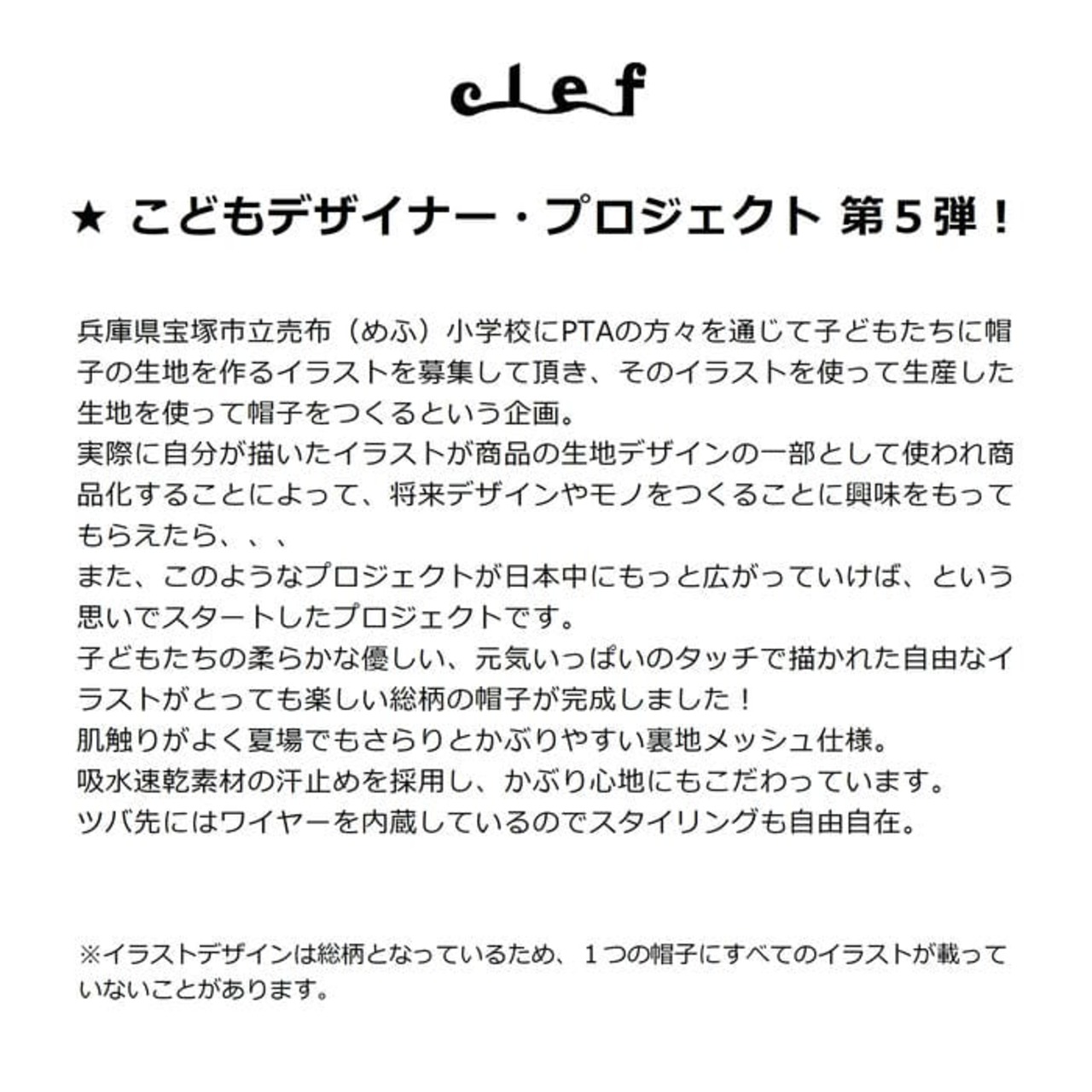 メーカー希望小売価格はメーカーカタログに基づいて掲載しています商品説明モデル名ClefADV. MFK HAT 5定価:4800+(税)サイズFREEカラーWHITE , NAVY概要次世代に繋がるプロジェクト。★ こどもデザイナー・プロジェクト 第5弾!兵庫県宝塚市立売布(めふ)小学校にPTAの方々を通じて子どもたちに帽子の生地を作るイラストを募集して頂き、そのイラストを使って生産した生地を使って帽子をつくるという企画。実際に自分が描いたイラストが商品の生地デザインの一部として使われ商品化することによって、将来デザインやモノをつくることに興味をもってもらえたら、、、また、このようなプロジェクトが日本中にもっと広がっていけば、という思いでスタートしたプロジェクトです。子どもたちの柔らかな優しい、元気いっぱいのタッチで描かれた自由なイラストがとっても楽しい総柄の帽子が完成しました!肌触りがよく夏場でもさらりとかぶりやすい裏地メッシュ仕様。吸水速乾素材の汗止めを採用し、かぶり心地にもこだわっています。ツバ先にはワイヤーを内蔵しているのでスタイリングも自由自在。※イラストデザインは総柄となっているため、1つの帽子にすべてのイラストが載っていないことがあります。特長ADJUSTABLE (汗止めの裏側にサイズ調整あり) 吸水速乾素材の汗止めWIRED BRIM(ツバ部分にワイヤー内蔵)サイズFREE : 約56cm~58cm(ご注意)同じサイズ表記でも生地素材(硬い柔らかい、薄い厚いなど)の要因で被った感覚は多少異なりますので予めご了承下さい。※注意事項●返品について●お客様都合によるご注文後の返品・キャンセル・交換は一切受け付けておりませんので、予めご了承下さい。●商品画像について●撮影状況、PC状況により、色合いが若干異なる場合がありますので、ご了承の上ご購入ください。●商品欠品について●掲載されている全ての商品は実店舗・他のネットショッピングでも販売しております。ご注文を承り次第在庫を確保しますが、完売の際はご容赦下さい。 ●送料について●北海道・沖縄・離島等の場合、別途送料が必要となります。
