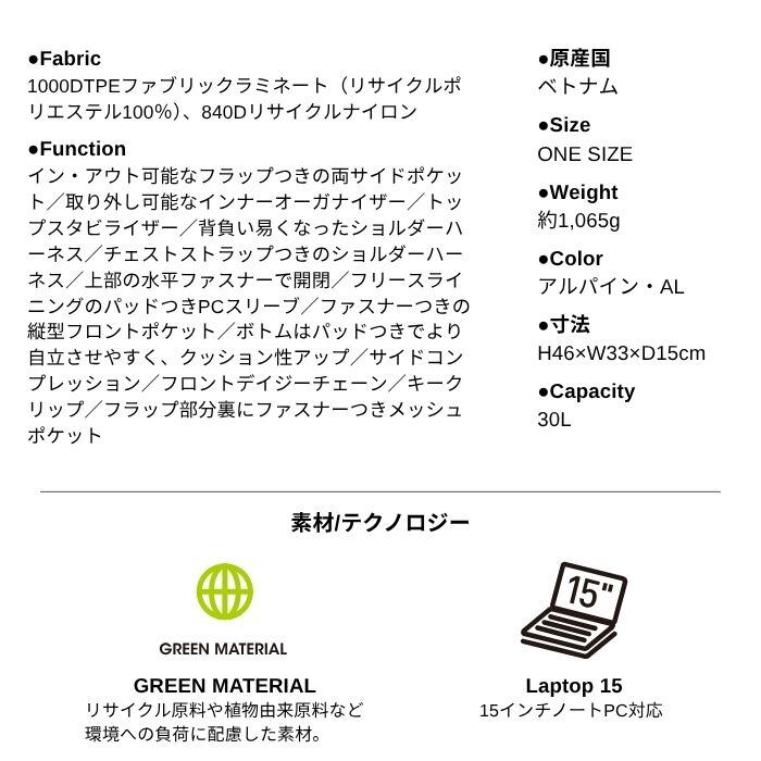 イン・アウト可能なフラップつきの両サイドポケット/取り外し可能なインナーオーガナイザー/トップスタビライザー/背負い易くなったショルダーハーネス/チェストストラップつきのショルダーハーネス/上部の水平ファスナーで開閉/フリースライニングのパッドつきPCスリーブ/ファスナーつきの縦型フロントポケット/ボトムはパッドつきでより自立させやすく、クッション性アップ/サイドコンプレッション/フロントデイジーチェーン/キークリップ/フラップ部分裏にファスナーつきメッシュポケット