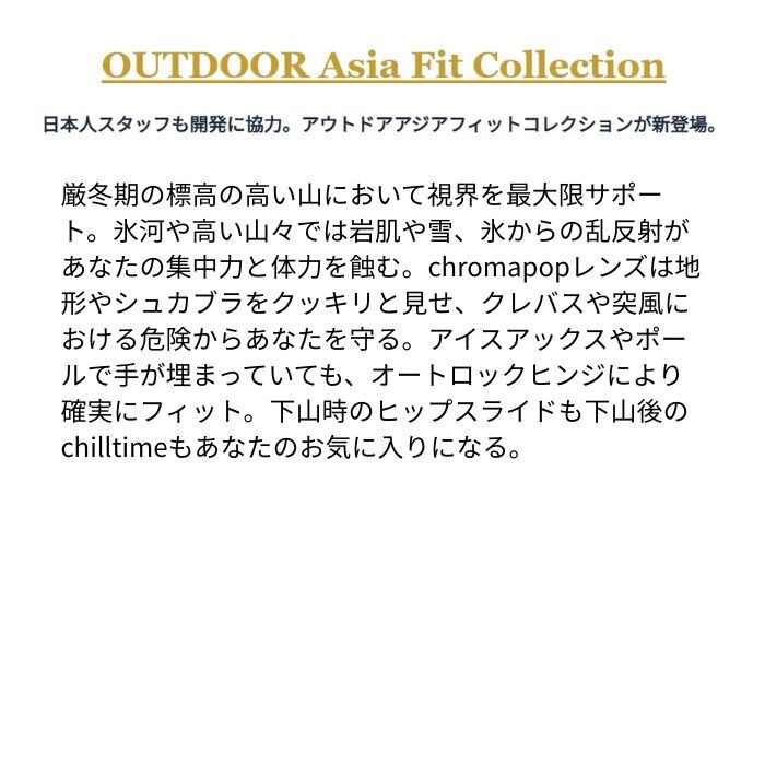 厳冬期の標高の高い山において視界を最大限サポート。氷河や高い山々では岩肌や雪、氷からの乱反射があなたの集中力と体力を蝕む。chromapopレンズは地形やシュカブラをクッキリと見せ、クレバスや突風における危険からあなたを守る。アイスアックスやポールで手が埋まっていても、オートロックヒンジにより確実にフィット。下山時のヒップスライドも下山後のchilltimeもあなたのお気に入りになる。