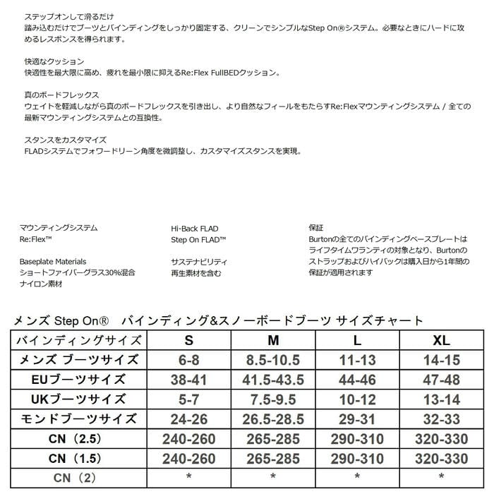 メーカー希望小売価格はメーカーカタログに基づいて掲載しています商品説明モデル名BUROTNMen's Step On Re:Flex Snowboard Bindings定価:39000+(税)サイズS , M , L , XLカラーCityStreets概要Step On スノーボードバインディング。 Step Onのシンプルさとユニバーサル対応のRe:Flexベースが融合。Step Onにバージョンアップ。メンズ Burton Step On Re:Flex スノーボードバインディングは、オールマウンテン性能を備えた、直感的なブーツ&バインディングのコネクションを提供します。トウの両サイドとヒールにある計3つのコネクションポイントでシンプルに、しっかりとホールドしながら優れたボードコントロールを実現します。*3Dマウンティングシステム搭載スノーボードに取り付けるには、3D ヒンジ ディスク(別売り)が必要です。3Dパターンシステムは、2014年より前に製造されたBurtonのボードに採用されています。特長ステップオンして滑るだけ踏み込むだけでブーツとバインディングをしっかり固定する、クリーンでシンプルなStep Onシステム。必要なときにハードに攻めるレスポンスを得られます。快適なクッション快適性を最大限に高め、疲れを最小限に抑えるRe:Flex FullBEDクッション。真のボードフレックスウェイトを軽減しながら真のボードフレックスを引き出し、より自然なフィールをもたらすRe:Flexマウンティングシステム / 全ての最新マウンティングシステムとの互換性。スタンスをカスタマイズFLADシステムでフォワードリーン角度を微調整し、カスタマイズスタンスを実現。スペックマウンティングシステムRe:FlexBaseplate Materialsショートファイバーグラス30%混合ナイロン素材Hi-Back FLADStep On FLADサステナビリティ再生素材を含む保証Burtonの全てのバインディングベースプレートはライフタイムワランティの対象となり、Burtonのストラップおよびハイバックは購入日から1年間の保証が適用されます。※注意事項●返品について●お客様都合によるご注文後の返品・キャンセル・交換は一切受け付けておりませんので、予めご了承下さい。●商品画像について●撮影状況、PC状況により、色合いが若干異なる場合がありますので、ご了承の上ご購入ください。●商品欠品について●掲載されている全ての商品は実店舗・他のネットショッピングでも販売しております。ご注文を承り次第在庫を確保しますが、完売の際はご容赦下さい。 ●送料について●北海道・沖縄・離島等の場合、別途送料が必要となります。