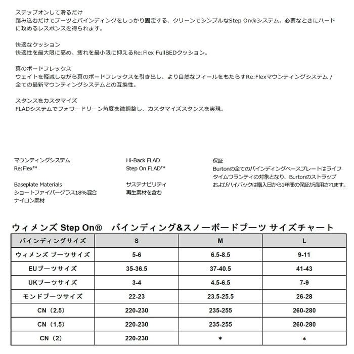 メーカー希望小売価格はメーカーカタログに基づいて掲載しています商品説明モデル名BUROTNWomen's Step On Re:Flex Snowboard Bindings定価:39000+(税)サイズS , M , LカラーBlack概要Step On スノーボードバインディング。 Step Onのシンプルさとオールマウンテン性能が融合。Step Onにバージョンアップ。ウィメンズ Burton Step On Re:Flex スノーボードバインディングは、オールマウンテン性能を備えた、直感的なブーツ&バインディングのコネクションを提供します。トウの両サイドとヒールにある計3つのコネクションポイントでシンプルに、しっかりとホールドしながら優れたボードコントロールを実現します。*3Dマウンティングシステム搭載スノーボードに取り付けるには、3D ヒンジ ディスク(別売り)が必要です。3Dパターンシステムは、2014年より前に製造されたBurtonのボードに採用されています。特長ステップオンして滑るだけ踏み込むだけでブーツとバインディングをしっかり固定する、クリーンでシンプルなStep Onシステム。必要なときにハードに攻めるレスポンスを得られます。快適なクッション快適性を最大限に高め、疲れを最小限に抑えるRe:Flex FullBEDクッション。真のボードフレックスウェイトを軽減しながら真のボードフレックスを引き出し、より自然なフィールをもたらすRe:Flexマウンティングシステム / 全ての最新マウンティングシステムとの互換性。スタンスをカスタマイズFLADシステムでフォワードリーン角度を微調整し、カスタマイズスタンスを実現。スペックマウンティングシステムRe:FlexBaseplate Materialsショートファイバーグラス18%混合ナイロン素材Hi-Back FLADStep On FLADサステナビリティ再生素材を含む保証Burtonの全てのバインディングベースプレートはライフタイムワランティの対象となり、Burtonのストラップおよびハイバックは購入日から1年間の保証が適用されます。※注意事項●返品について●お客様都合によるご注文後の返品・キャンセル・交換は一切受け付けておりませんので、予めご了承下さい。●商品画像について●撮影状況、PC状況により、色合いが若干異なる場合がありますので、ご了承の上ご購入ください。●商品欠品について●掲載されている全ての商品は実店舗・他のネットショッピングでも販売しております。ご注文を承り次第在庫を確保しますが、完売の際はご容赦下さい。 ●送料について●北海道・沖縄・離島等の場合、別途送料が必要となります。