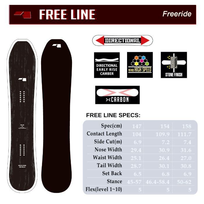 従来のFREE LINEをよりパワフルでキレのあるボードにするため、キャンバー構造とアウトラインを一新した、まったく新しいボードに生まれ変わりました。どんな雪の状況でもターンエントリーが快適なアーリーライズキャンバーと、適度な浮力、そしてノーズをフォールラインに落とし込めるマイルドなテーパードとノーズ形状、最もGがかかるターン後半はテールのフレックスと粘り感、そしてグリップする深いサイドカットで、スピードと安定感のある軽快なライディングを可能にします。