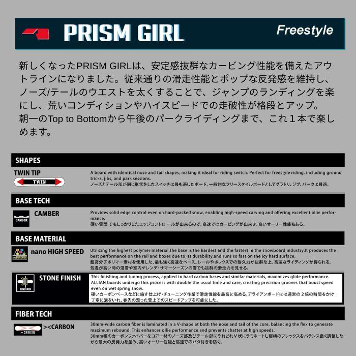 新しくなったPRISM GIRLは、安定感抜群なカービング性能を備えたアウトラインになりました。従来通りの滑走性能とポップな反発感を維持し、ノーズ/テールのウエストを太くすることで、ジャンプのランディングを楽にし、荒いコンディションやハイスピードでの走破性が格段とアップ。