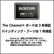 3年保証 Burtonは、2014シーズン以降のThe Channelボード(このページのボードも含まれます)に対し、購入日から3年間、修理または交換の保証対応を行います。