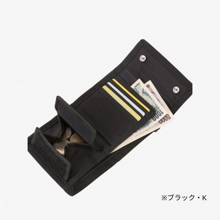 開閉しやすいスナップボタン式の大きいフラップ/ファスナーつき札入れポケット/大きく開くマチつきのコインポケット/カードスロット/アクセサリーカラビナなどをつけられるハイパロンタブ