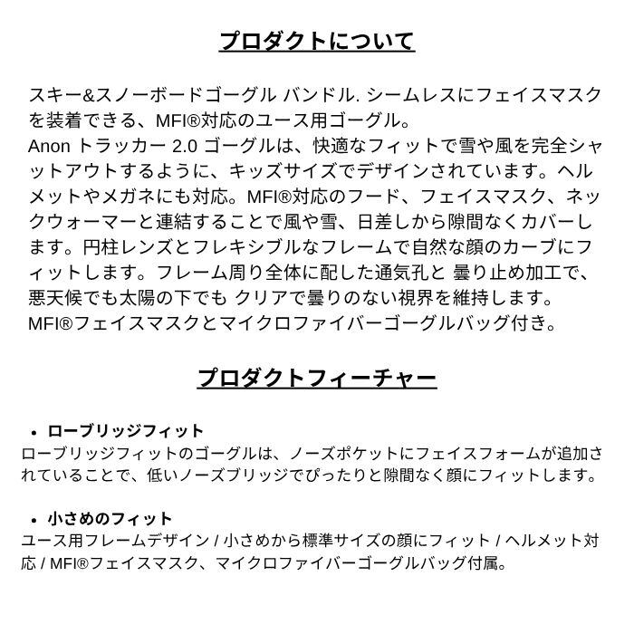 Anon トラッカー 2.0 ゴーグルは、快適なフィットで雪や風を完全シャットアウトするように、キッズサイズでデザインされています。ヘルメットやメガネにも対応。MFI?対応のフード、フェイスマスク、ネックウォーマーと連結することで風や雪、日差しから隙間なくカバーします。円柱レンズとフレキシブルなフレームで自然な顔のカーブにフィットします。フレーム周り全体に配した通気孔と 曇り止め加工で、悪天候でも太陽の下でも クリアで曇りのない視界を維持します。MFI?フェイスマスクとマイクロファイバーゴーグルバッグ付き。詳細・ローブリッジフィット