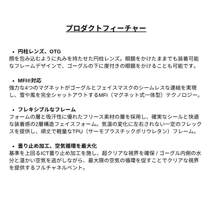 基準を上回るICT曇り止め加工を施し、超クリアな視界を確保 / ゴーグル内側の水分と温かい空気を逃がしながら、最大限の空気の循環を促すことでクリアな視界を提供するフルチャネルベント。スペック・技術仕様