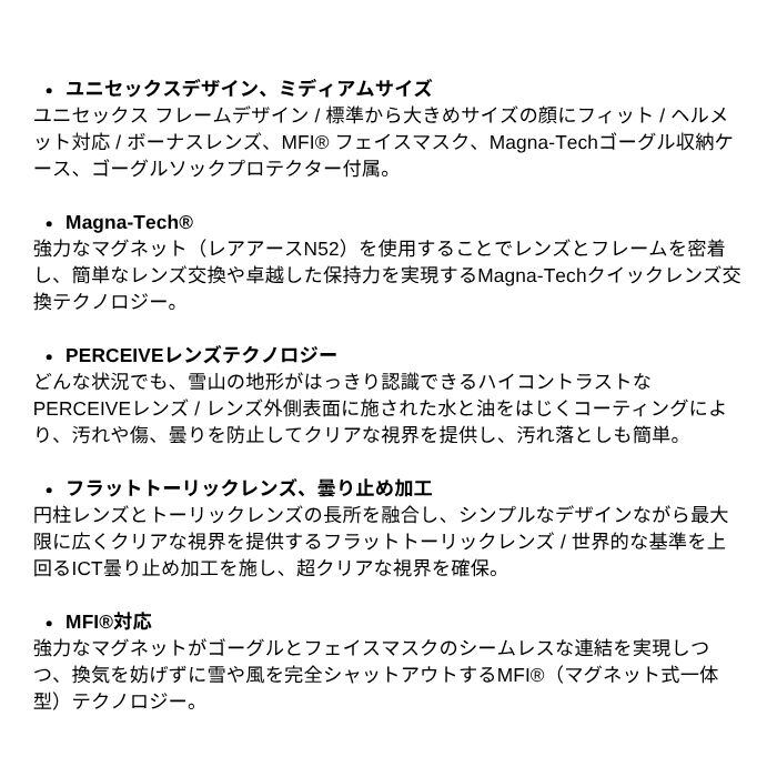 ユニセックス フレームデザイン / 標準から大きめサイズの顔にフィット / ヘルメット対応 / ボーナスレンズ、MFI? フェイスマスク、Magna-Techゴーグル収納ケース、ゴーグルソックプロテクター付属。