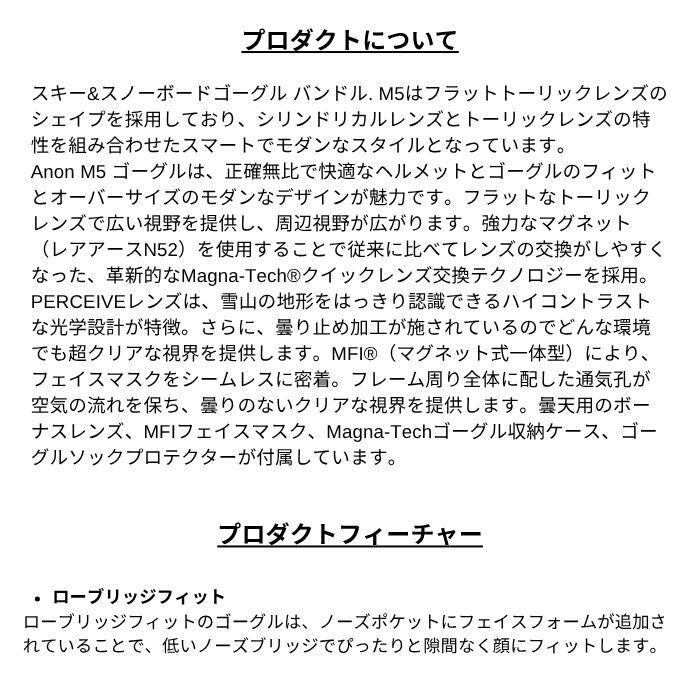 Anon M5 ゴーグルは、正確無比で快適なヘルメットとゴーグルのフィットとオーバーサイズのモダンなデザインが魅力です。フラットなトーリックレンズで広い視野を提供し、周辺視野が広がります。強力なマグネット(レアアースN52)を使用することで従来に比べてレンズの交換がしやすくなった、革新的なMagna-Tech?クイックレンズ交換テクノロジーを採用。PERCEIVEレンズは、雪山の地形をはっきり認識できるハイコントラストな光学設計が特徴。さらに、曇り止め加工が施されているのでどんな環境でも超クリアな視界を提供します。MFI?(マグネット式一体型)により、フェイスマスクをシームレスに密着。フレーム周り全体に配した通気孔が空気の流れを保ち、曇りのないクリアな視界を提供します。曇天用のボーナスレンズ、MFIフェイスマスク、Magna-Techゴーグル収納ケース、ゴーグルソックプロテクターが付属しています。詳細・ローブリッジフィット