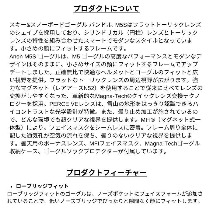 Anon M5S ゴーグルは、M5 ゴーグルの高度なパフォーマンスとモダンなデザインはそのままに、小さめサイズの顔にフィットするフレームでアップデートしました。正確無比で快適なヘルメットとゴーグルのフィットと広い視野を提供。フラットなトーリックレンズの周辺視野が広がります。強力なマグネット(レアアースN52)を使用することで従来に比べてレンズの交換がしやすくなった、革新的なMagna-Tech?クイックレンズ交換テクノロジーを採用。PERCEIVEレンズは、雪山の地形をはっきり認識できるハイコントラストな光学設計が特徴。また、曇り止め加工が施されているので、どんな環境でも超クリアな視界を提供します。MFI?(マグネット式一体型)により、フェイスマスクをシームレスに密着。フレーム周り全体に配した通気孔が空気の流れを保ち、曇りのないクリアな視界を提供します。曇天用のボーナスレンズ、MFIフェイスマスク、Magna-Techゴーグル収納ケース、ゴーグルソックプロテクターが付属しています。詳細・ローブリッジフィット
