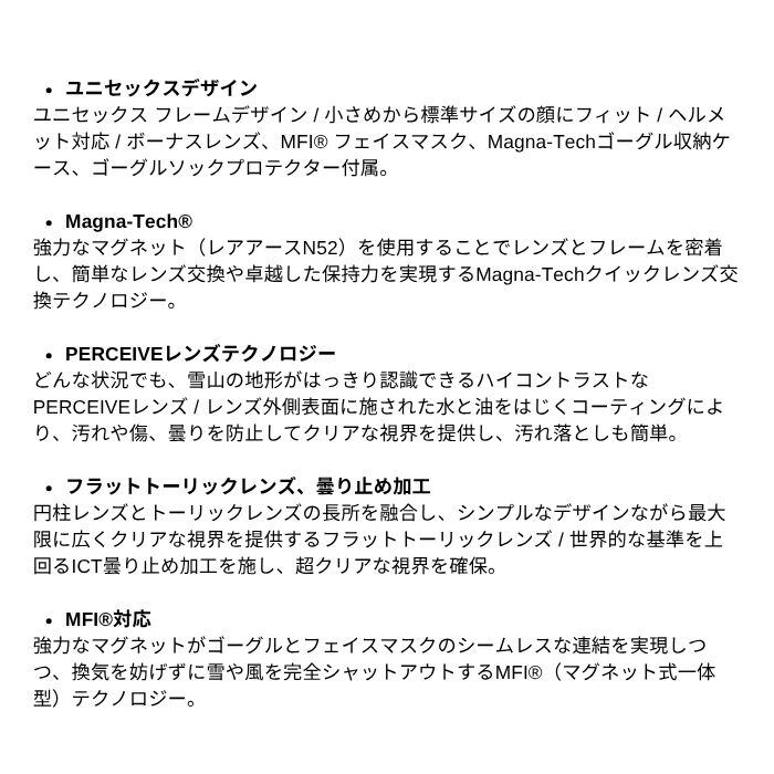 ユニセックス フレームデザイン / 小さめから標準サイズの顔にフィット / ヘルメット対応 / ボーナスレンズ、MFI? フェイスマスク、Magna-Techゴーグル収納ケース、ゴーグルソックプロテクター付属。