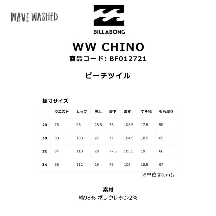 BILLABONG WW CHINO BF012721 ロングパンツ チノ ウォッシュ加工 ピーチツイル生地 ビンテージライク 洗い加工 チノパン KHA MDB RAV ロゴ ビラボン 正規品