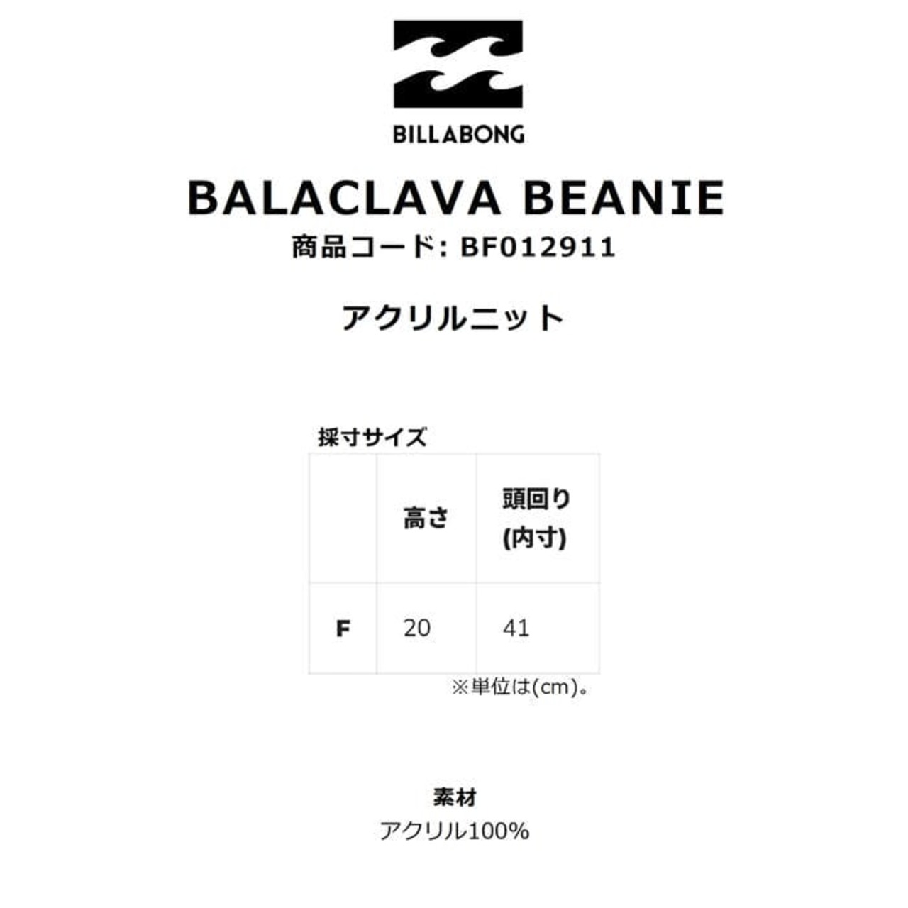 定価:4200+(税)サイズFカラーBLK , NVY概要ビーニーとバラクラバの2WAYスタイルが楽しめるビーニー。厚みのあるリブ編みアクリルニットを使用し、折り返したカフ左サイドにBILLABONGのワッペンを配置。カフを折らずに伸ばすとバラクラバとして着用することができ、顔周りから首元までを防寒することができます。特長アクリルニット※注意事項●返品について●