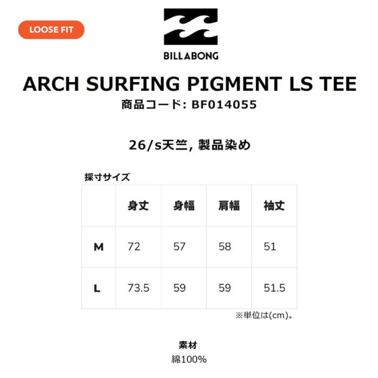 BILLABONG ARCH SURFING PIGMENT LS TEE BF014055 Tシャツ 長袖 ルーズフィット ピグメント加工 フロッキープリント ロング丈 ロゴ ロンT ビラボン 正規品