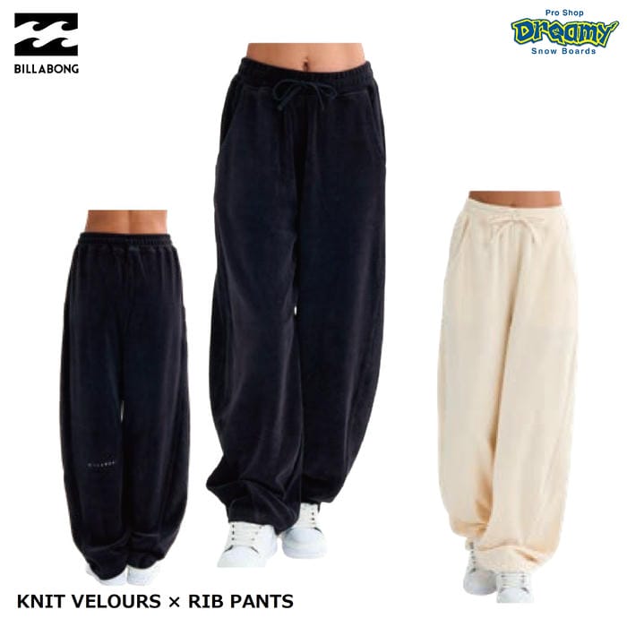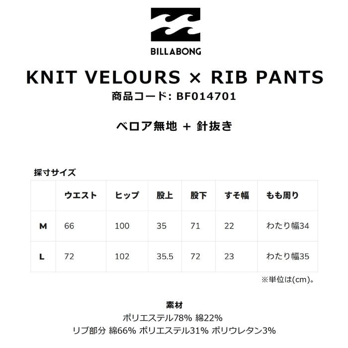BILLABONG KNIT VELOURS × RIB PANTS BF014701 パンツ ロング丈 ベロア素材 無地 ウエストゴム仕様 ドローコード サイドポケット 刺繍 ロゴ ビラボン 正規品