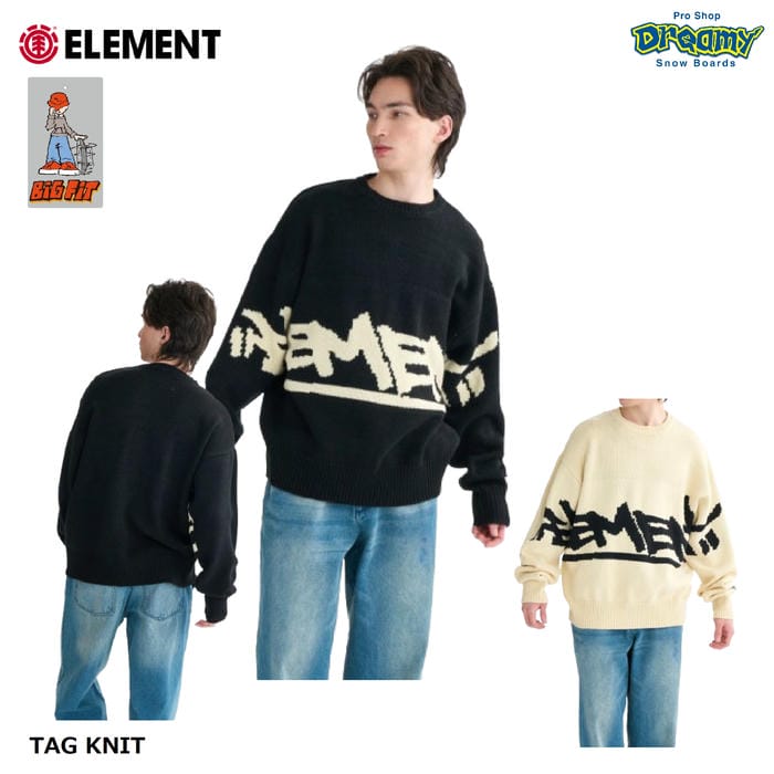 ELEMENT TAG KNIT BF022650 セーター ビッグフィット 長袖 アクリル100% ジャガード編み ロゴ ネーム 洗濯可能 ニット M-XL FBK OFF エレメント 正規品