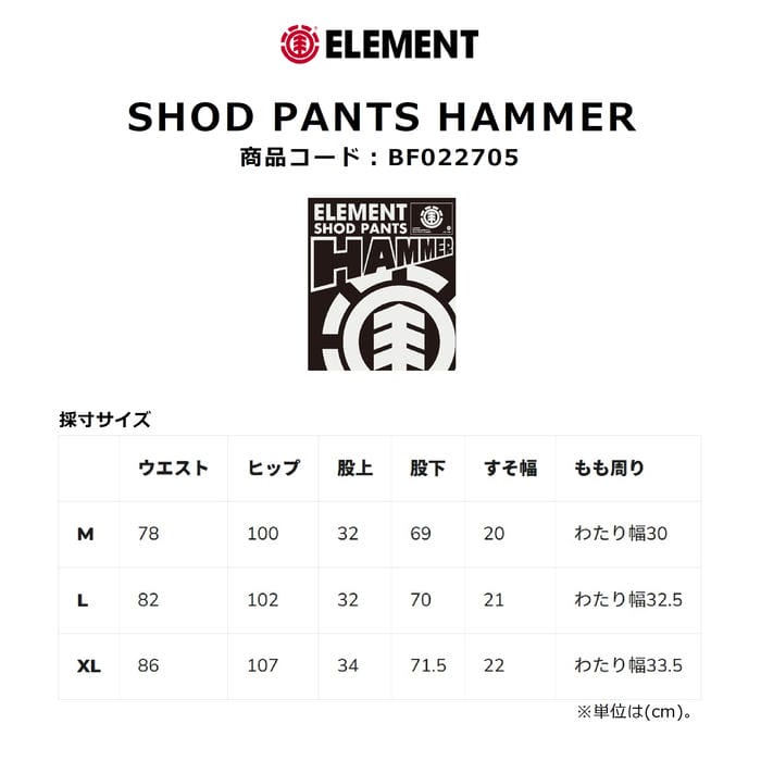 後ろウエストにはHAMMERラインを示す、にはELEMENTロゴの黒いパッチワーク。程よいワイドシルエット。