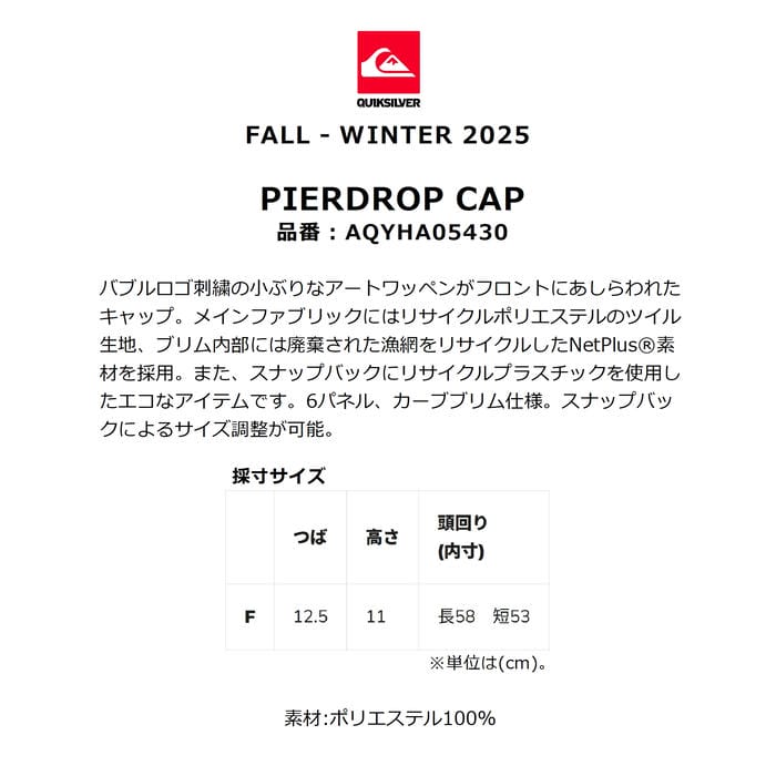 QUIKSILVER PIERDROP CAP AQYHA05430 キャップ 6パネル カーブブリム スナップバック 刺繍 ワッペン ポリエステル ツイル ロゴ シンプル クイックシルバー 正規品