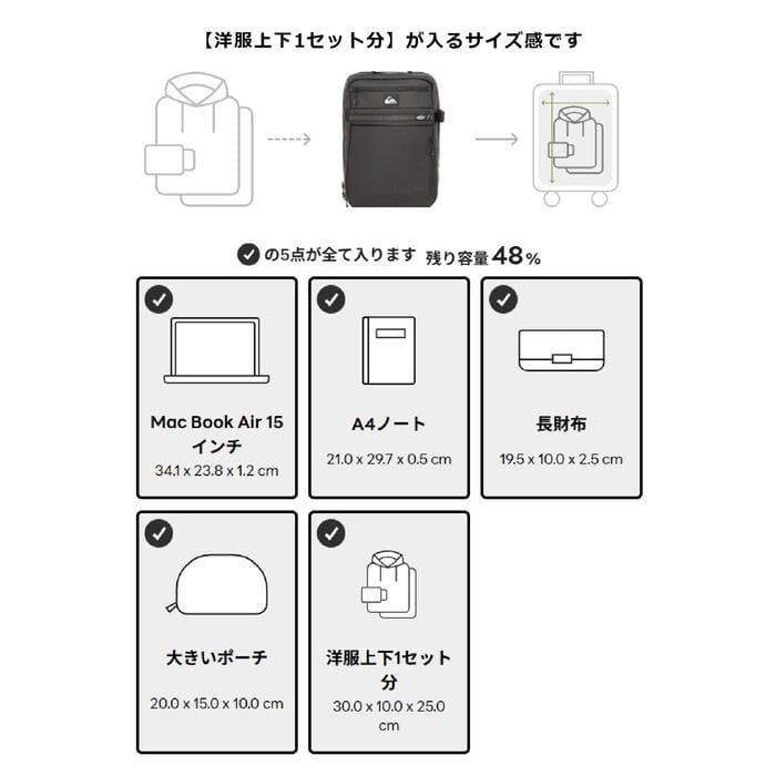 QUIKSILVER CABIN LUG EQYBL03204 キャリーケース 41L 機内持ち込みサイズキャスター付き 観音開きタイプ ジップポケット 伸縮ハンドル クイックシルバー 正規品