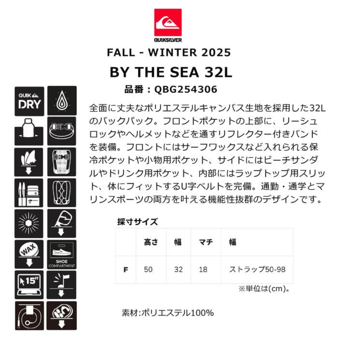 QUIKSILVER BY THE SEA 32L QBG254306 バックパック ラップトップスリーブ 保冷ポケット U字ベルト リフレクター付きバンド ロゴ クイックシルバー 正規品