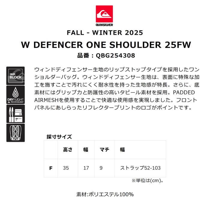 QUIKSILVER W DEFENCER ONE SHOULDER QBG254308 ワンショルダーバッグ 容量5L 耐水 リフレクタープリント ボディバッグ ジップトップ ロゴ クイックシルバー 正規品