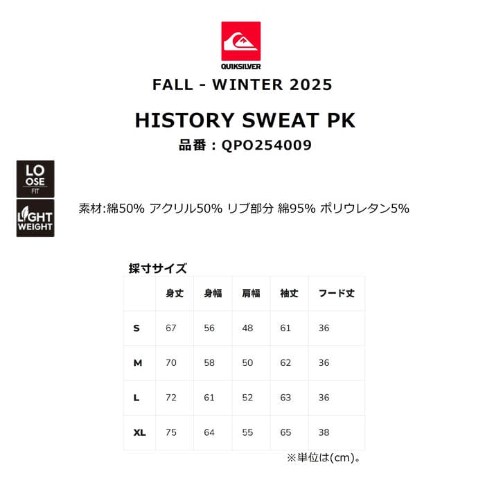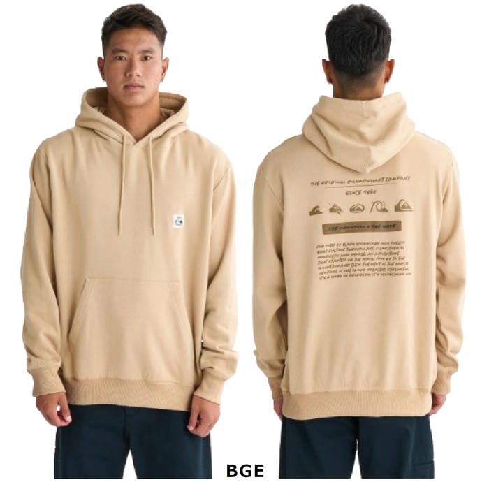 定価:9300+(税)サイズS , M , L , XLカラーBLK , BGE , IVY , HTR概要アフターサーフを意識したストレスフリーのフーディスウェット。軽量のソフトタッチで着心地が良く、適度な裏起毛による快適な保温性が冷えた体を包み込みます。左胸にバブルロゴラベルをあしらい、背中にはQUIKSILVERのヒストリーを彷彿とさせるストーリーと象徴的なグラフィックをプリントしました。シルエットは程良くゆとりのあるルーズフィット。素材綿50% アクリル50%