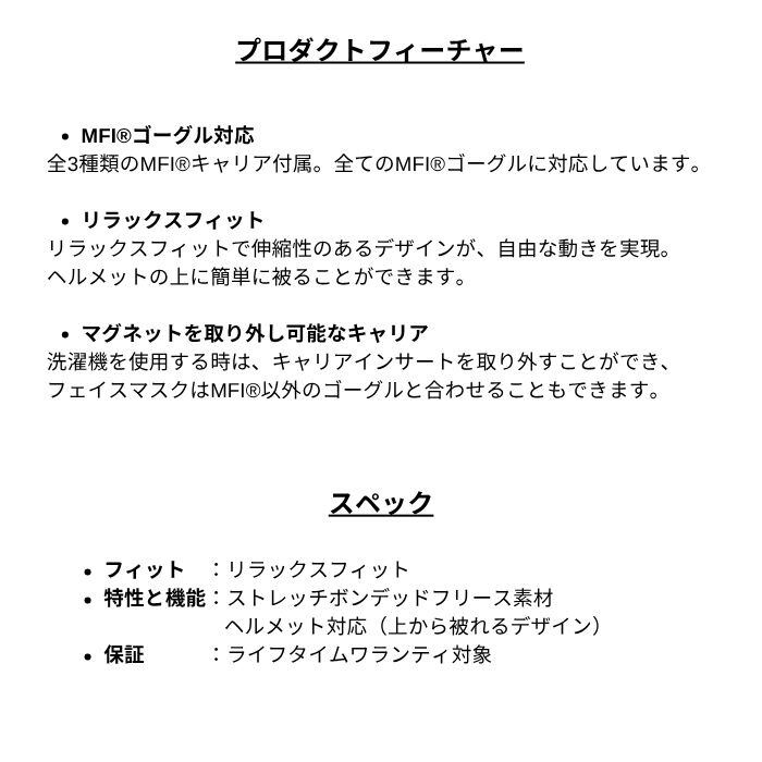 洗濯機を使用する時は、キャリアインサートを取り外すことができ、フェイスマスクはMFI?以外のゴーグルと合わせることもできます。スペック・フィット