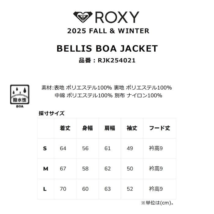 ROXY BELLIS BOA JACKET RJK254021 ジャケット ボア 撥水加工 中綿 ダブルジップ キルトステッチ裏地 ポケット アジャスター付きゴム仕様 ロゴ ロキシー 正規品