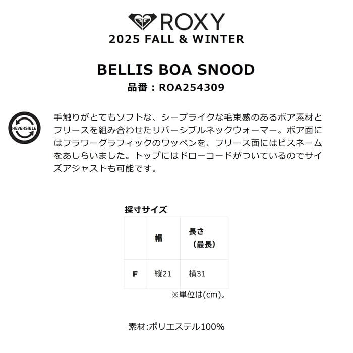 ROXY BELLIS BOA SNOOD ROA254309 ネックウォーマー リバーシブル ボア フリース ワッペン ピスネーム ドローコード ポリエステル ロゴ スヌード ロキシー 正規品