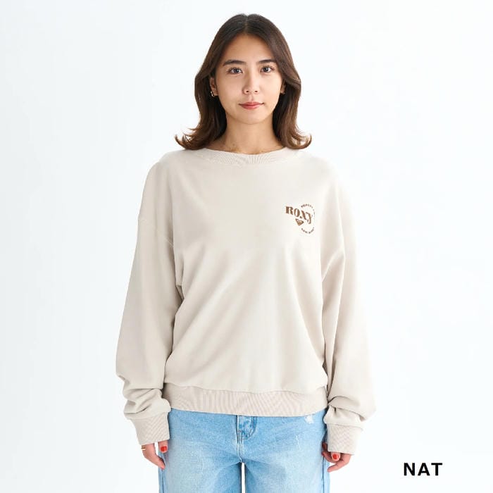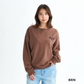 定価:5800+(税)サイズS , M , LカラーBLK , NAT , BRN概要もっちりとした質感の裏毛素材を使ったクルーネックトップス。ドロップショルダーでゆったりとしたシルエットです。ショルダーの切り替え部分と襟元は同色の表ぶりステッチで仕上げました。左胸にはフロッキープリントでROXYロゴのグラフィックを、バックネックにはROXYハートの刺繍をあしらいました。同素材のボトムとセットアップでのコーディネートもおすすめです。素材綿60% ポリエステル40%