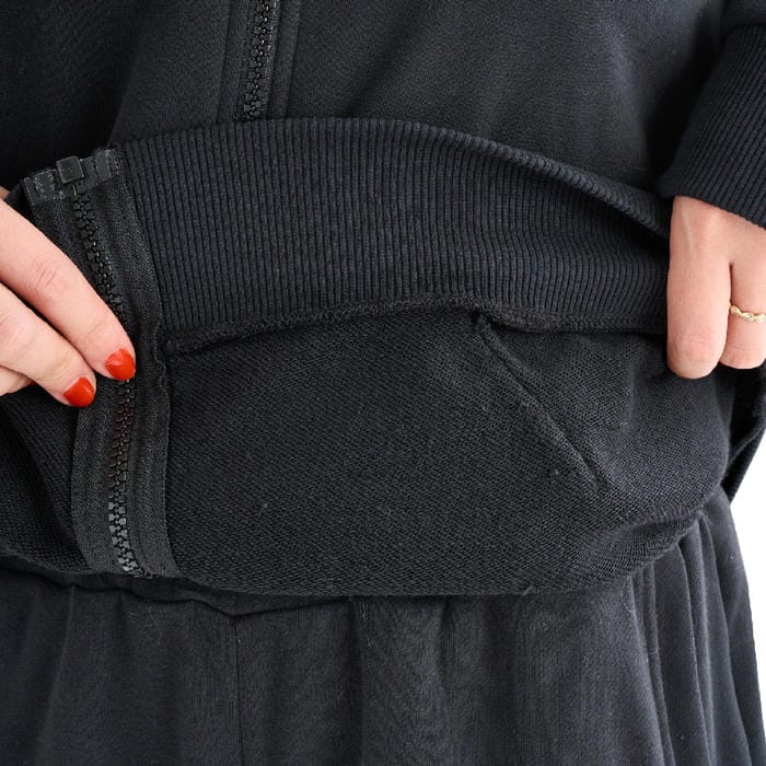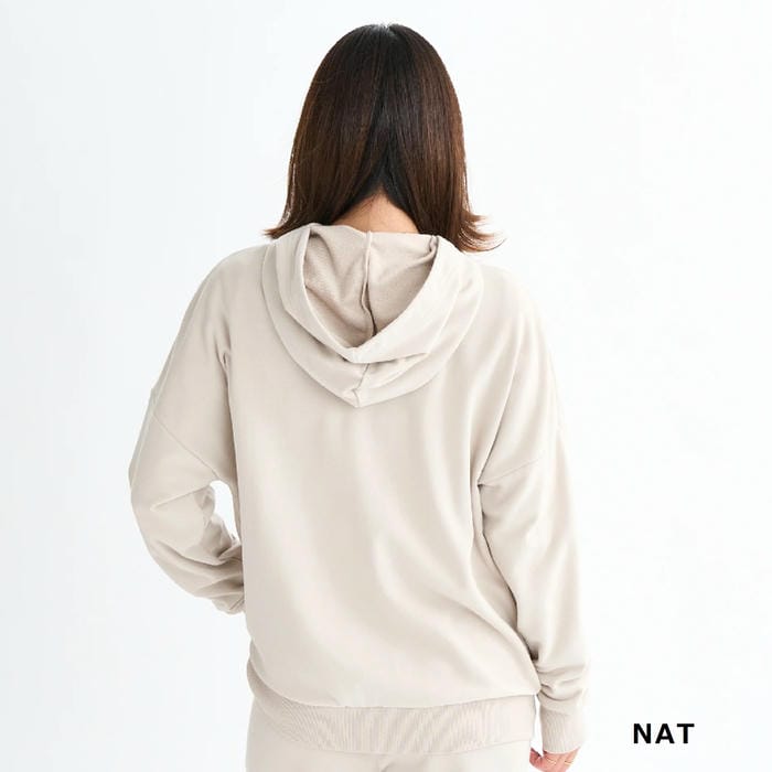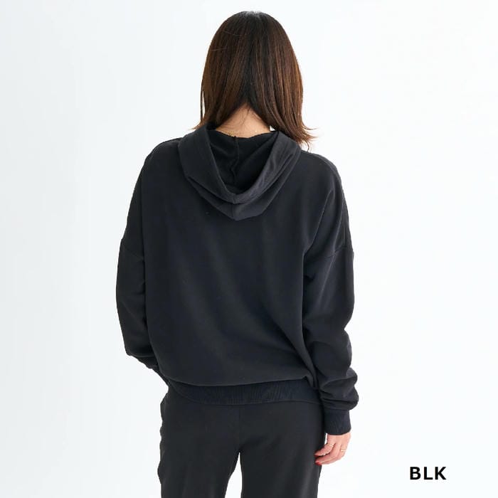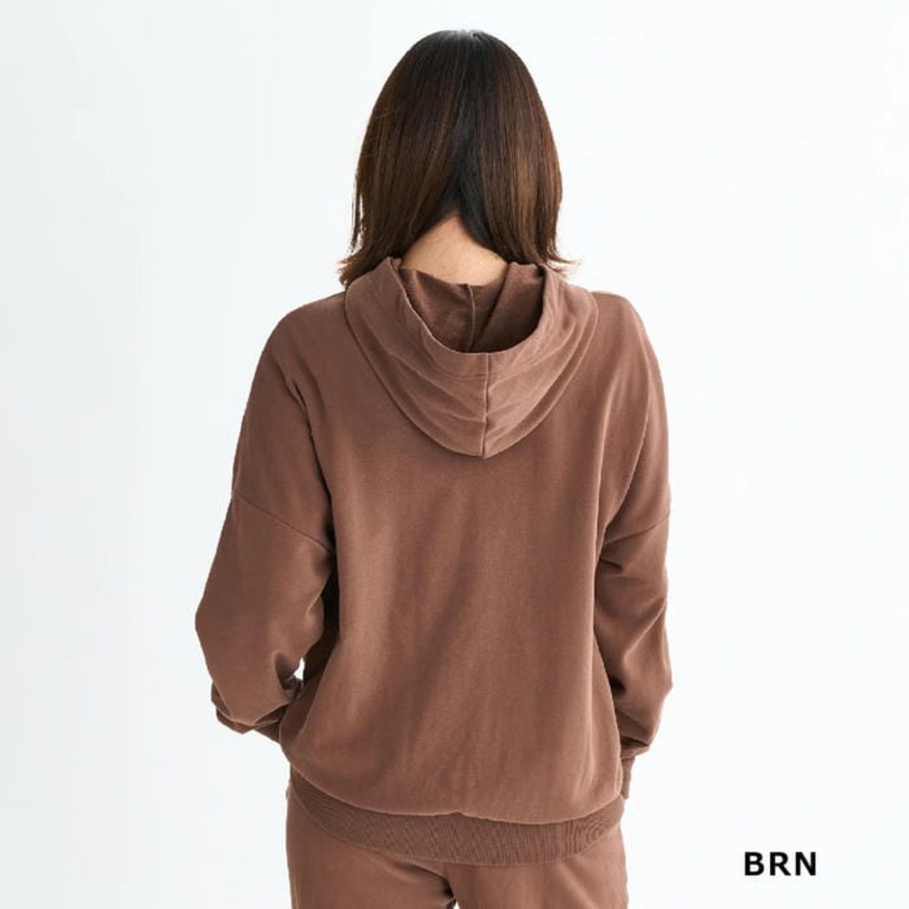 定価:7000+(税)サイズS , M , LカラーBLK , NAT , BRN概要もっちりとした質感の裏毛素材を使ったジップアップフーディ。ドロップショルダーで腰までカバーする着丈のゆったりとしたシルエットです。ショルダーの切り替え部分と襟元は同色の表ぶりステッチで仕上げました。襟に高さのあるデザインなので、フードを被ったときに首元が空かないのもポイント。左胸にはフロッキープリントでROXYロゴのグラフィックをあしらいました。同素材のボトムとセットアップでのコーディネートもおすすめです。カンガルーポケット付き。素材綿60% ポリエステル40%