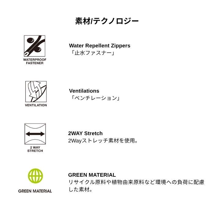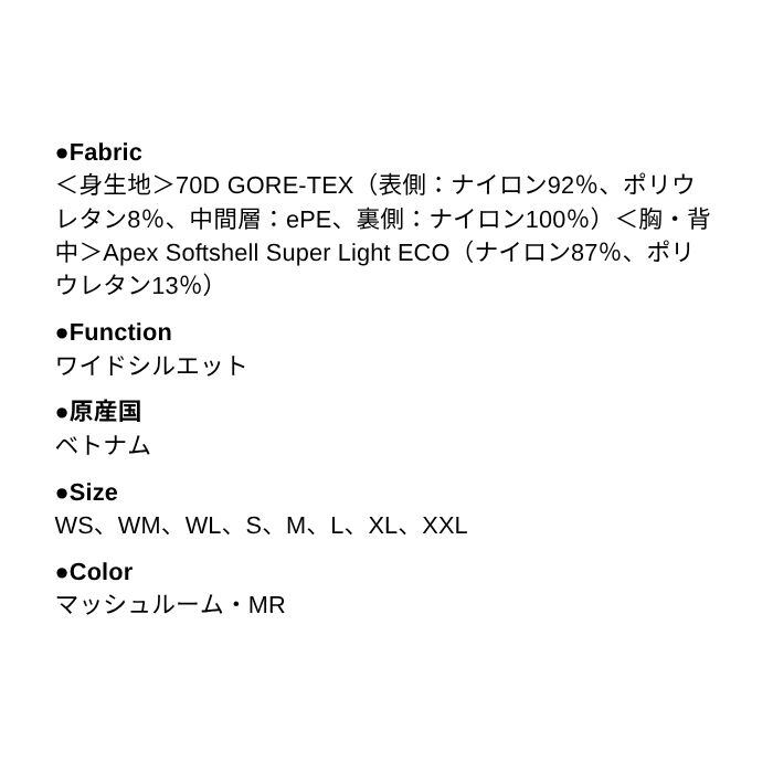 <身生地>70D GORE-TEX(表側:ナイロン92%、ポリウレタン8%、中間層:ePE、裏側:ナイロン100%)<胸・背中>Apex Softshell Super Light ECO(ナイロン87%、ポリウレタン13%)