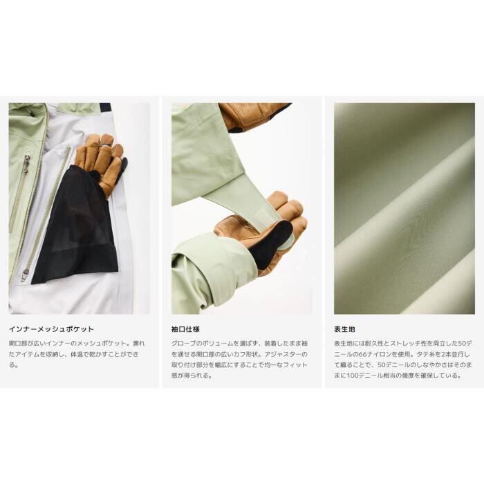 18度目の冬を迎えるブランドの原点にしてフラッグシップモデルです。初代から変わらぬコンセプトは、バックカントリーのいかなる場面でもストレスなく行動できるプロテクションシェル。完全防水と通気性を両立した「Tasma」を使用し、現状では最高水準の撥油性を兼ね備える撥水加工を施しています。胸元から脇腹にかけて開く特徴的なベンチレーションは換気効率と操作性を追求したもので、素材の通気性と合わせて蒸れを抑え、ウェア内をドライに保って低体温症のリスクを軽減します。大きく動く肩関節のROM(Range of Motion=可動域)を考慮した立体裁断は、滑り手のどんな動きも妨げずに追従。今季はフードや裾の折り返し部分を表生地と揃えて耐久性をさらに高めました。特長型番/TB253-01M