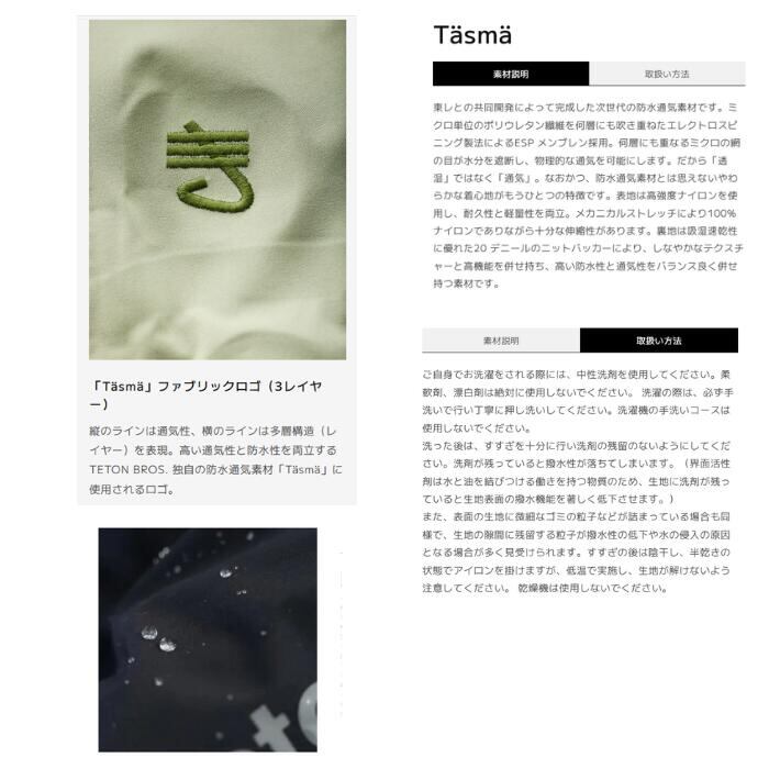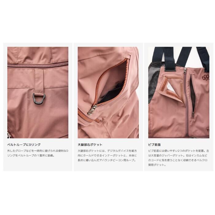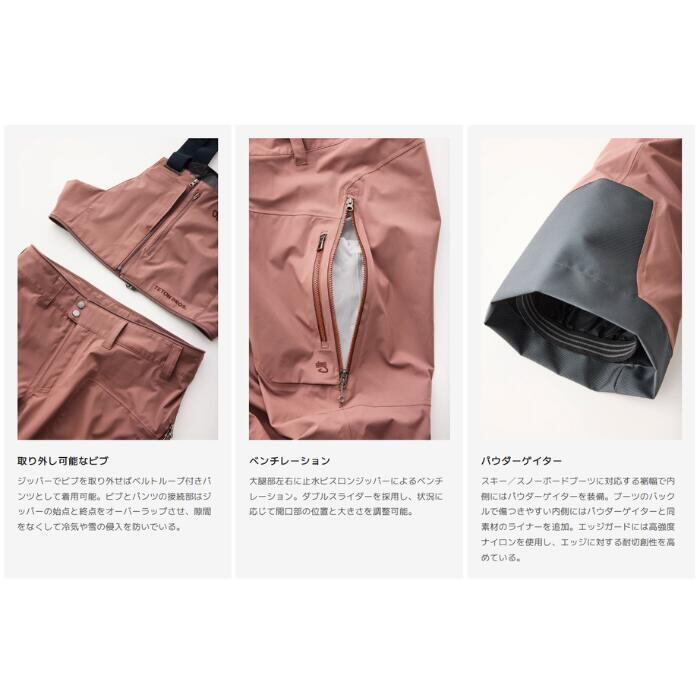 バックカントリーのいかなる場面でもストレスなく行動できるビブパンツです。完全防水と通気性を両立した「Tasma」を使用し、現状では最高水準の撥油性を兼ね備える撥水加工を施しています。太すぎず、細すぎないシルエットと素材がもつ伸縮性を最大限に活かしたカッティングにより、大きく脚を動かす登りでも、素早く動く滑りでも、その動作を妨げません。機能面での最大の特徴はビブを取り外せること。春先などにビブを外してパンツとして使用できます。ウェストのファスナーは片手で簡単に操作でき、パンツと同じ感覚で用足しできるのもポイント。大きく開くサイドベンチレーションによって行動中のオーバーヒートを防ぎます。特長型番/TB253-02M