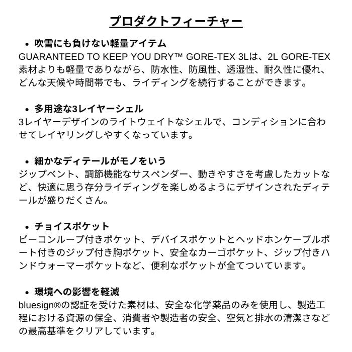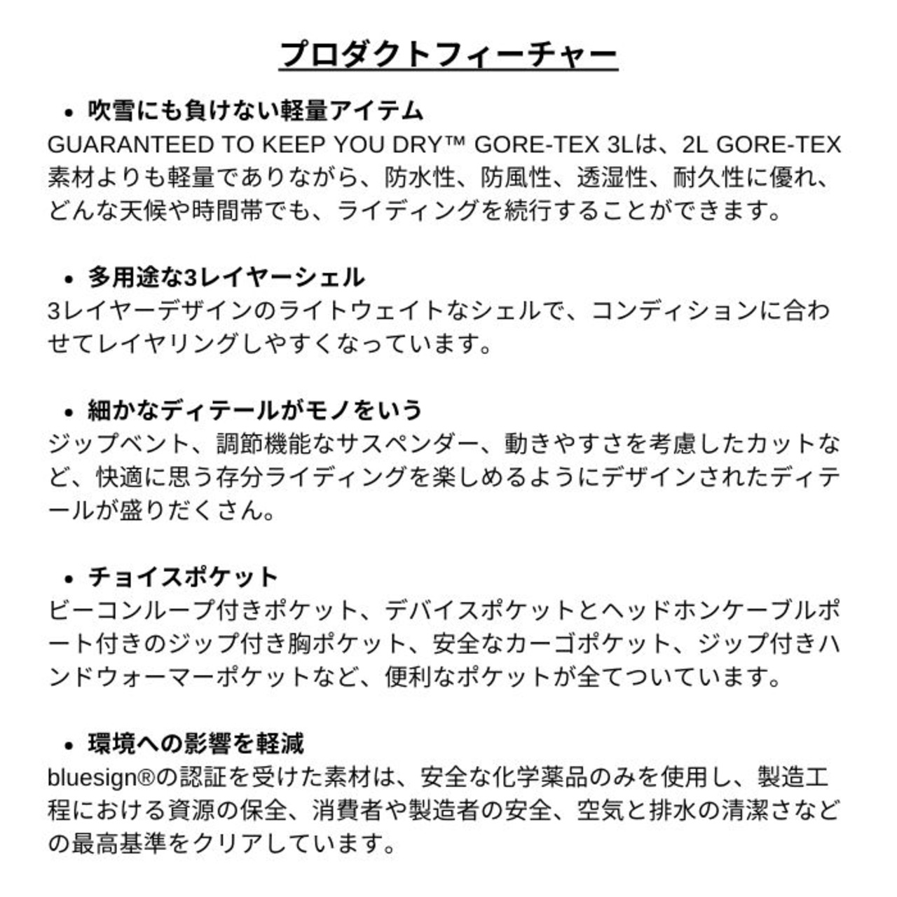 定価:86000+(税)サイズXS , S , M , L , XLカラーSummit_Taupe概要GORE-TEX ウインター スノー ビブパンツ. 伸縮性のある3レイヤーのGORE-TEXシェルを採用。リラックスフィット。