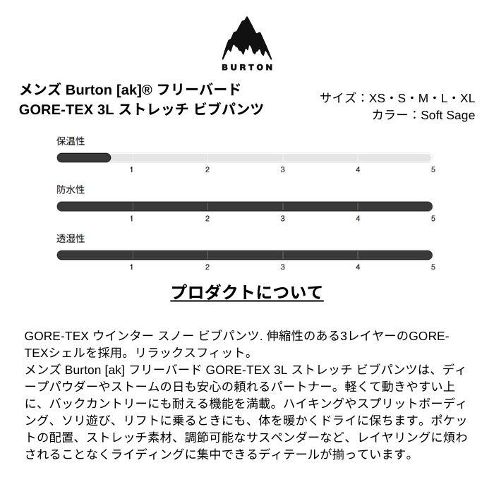 BURTON バートン メンズ [ak] フリーバード GORE-TEX 3L ストレッチ ビブパンツ 100241DEW Soft Sage 伸縮性 3レイヤー スノーボード ウェア 正規品