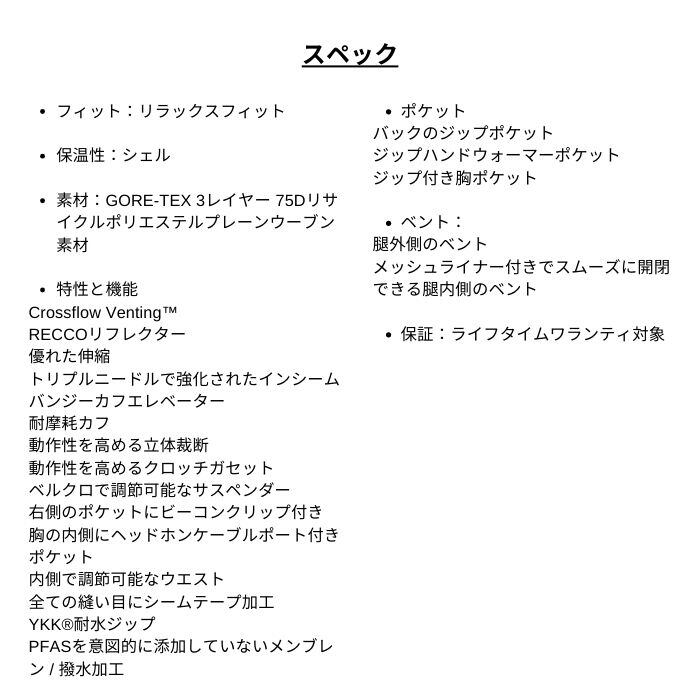 定価:86000+(税)サイズXS , S , M , L , XLカラーSoft_Sage概要GORE-TEX ウインター スノー ビブパンツ. 伸縮性のある3レイヤーのGORE-TEXシェルを採用。リラックスフィット。