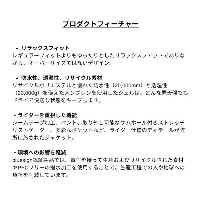 bluesign認証製品では、責任を持って生産およびリサイクルされた素材やPFCフリーの撥水加工を使用することで、生産工程での人や地球への負担を削減しています。スペック・フィット:リラックスフィット