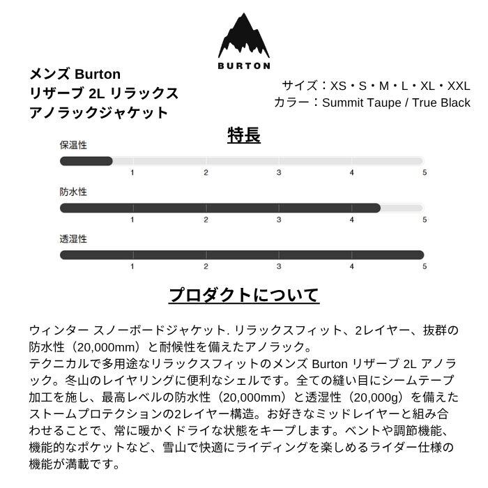 BURTON バートン メンズ Burton リザーブ 2L リラックス アノラックジャケット 3025910E2 Summit Taupe/True Black 防水性20,000mm スノー ウェア 正規品