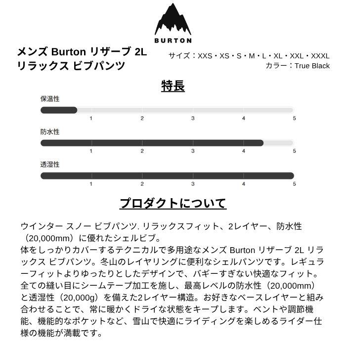 BURTON バートン メンズ Burton リザーブ 2L リラックス ビブパンツ 3026910A0 True Black 防水性20,000mm 2レイヤー スノーボード ウェア 正規品