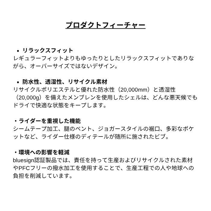 bluesign認証製品では、責任を持って生産およびリサイクルされた素材やPFCフリーの撥水加工を使用することで、生産工程での人や地球への負担を削減しています。スペック・フィット:リラックスフィット