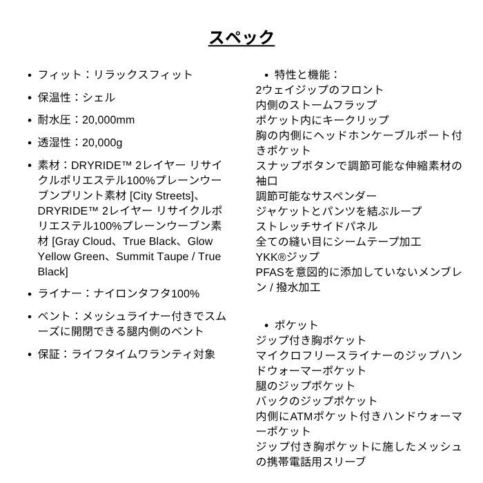定価:34000+(税)サイズXXS , XS , S , M , L , XL , XXL , XXXLカラーTrue_Black概要ウインター スノー ビブパンツ. リラックスフィット、2レイヤー、防水性(20,000mm)に優れたシェルビブ。