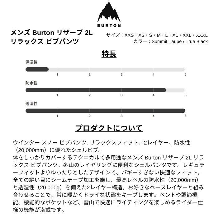 BURTON バートン メンズ Burton リザーブ 2L リラックス ビブパンツ 3026910E2 Summit Taupe/True Black 防水性20,000mm 2レイヤー スノーボード ウェア 正規品