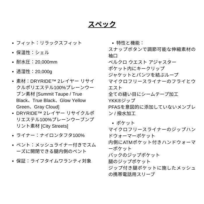・素材:DRYRIDE? 2レイヤー リサイクルポリエステル100%プレーンウーブン素材 [Summit Taupe / True Black、True Black、Glow Yellow Green、Gray Cloud]