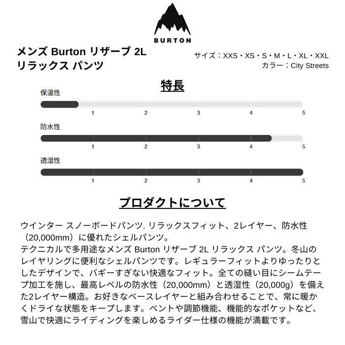 BURTON バートン メンズ Burton リザーブ 2L リラックス パンツ 3027110EZ City Streets 防水性20,000mm 2レイヤー スノーボード ウェア 正規品