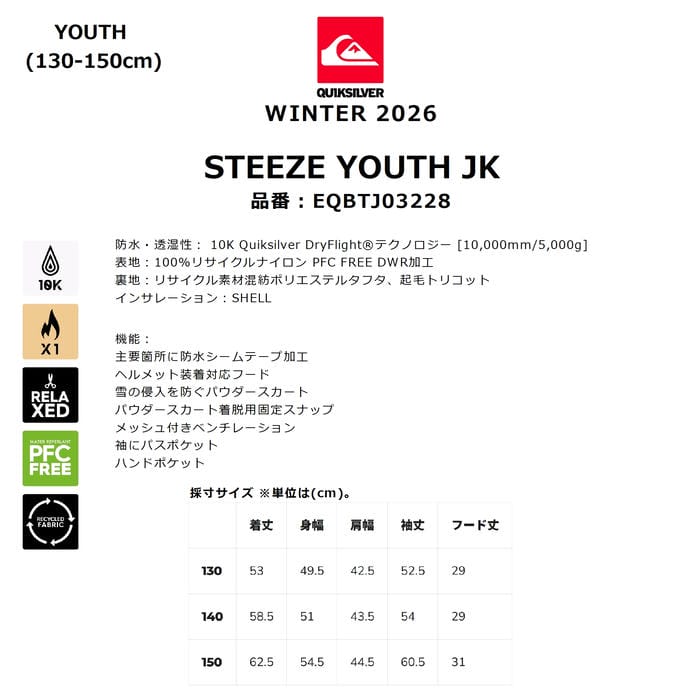 QUIKSILVER MISTY STEEZE YOUTH JK EQBTJ03228 キッズ スノージャケット 130-150cm リラックスフィット 防水 撥水 プルオーバー ロゴ クイックシルバー 正規品