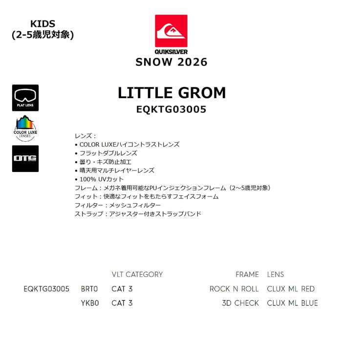 QUIKSILVER LITTLE GROM EQKTG03005 キッズ スノーゴーグル 2-5歳対象 メガネ装着可能 フラットダブルレンズ 曇り・キズ防止加工 クイックシルバー 正規品