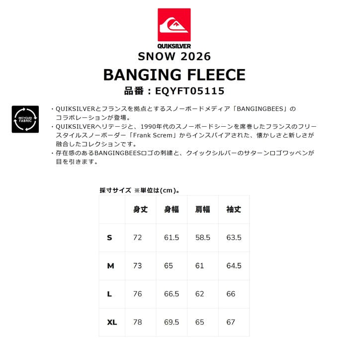 定価:11000+(税)サイズS , M , L , XLカラーKVJ0概要・QUIKSILVERとフランスを拠点とするスノーボードメディア「BANGINGBEES」のコラボレーションが登場。