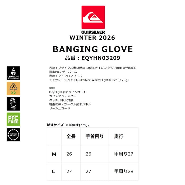 QUIKSILVER BANGING GLOVE EQYHN03209 スノーグローブ 撥水 タッチパネル対応 防水インサート フリース裏地 スノーボード コラボ ロゴ クイックシルバー 正規品