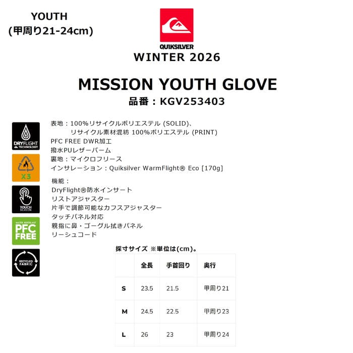 QUIKSILVER MISSION YOUTH GLOVE KGV253403 キッズ スノーグローブ 甲周り21-24cm 撥水 防水 タッチパネル対応 ユース スノーボード クイックシルバー 正規品